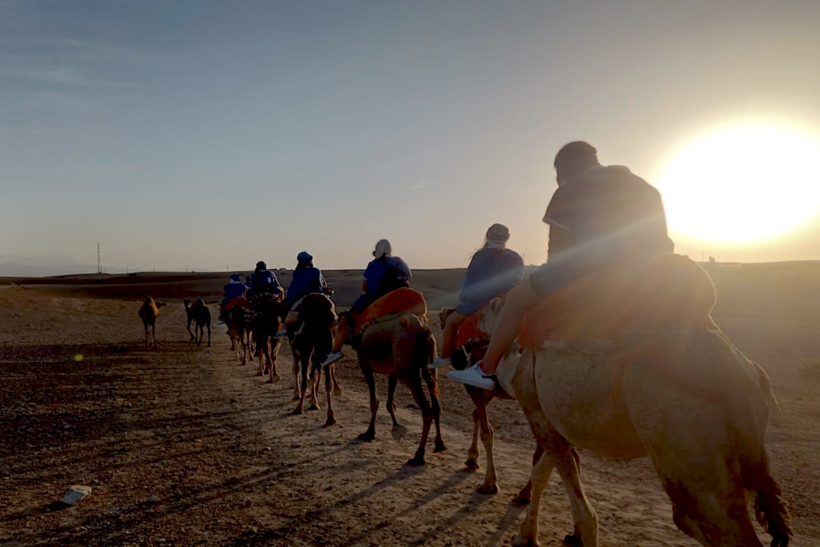 骑着骆驼穿越令人惊叹的风景,等待即将到来的日落。