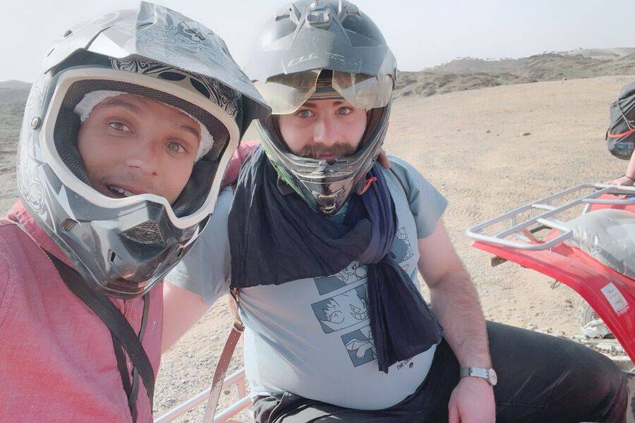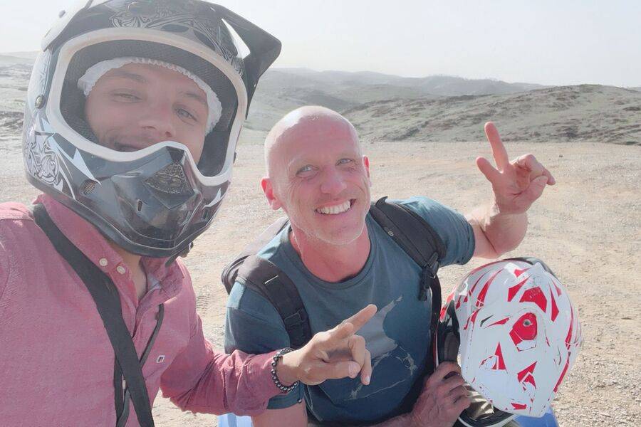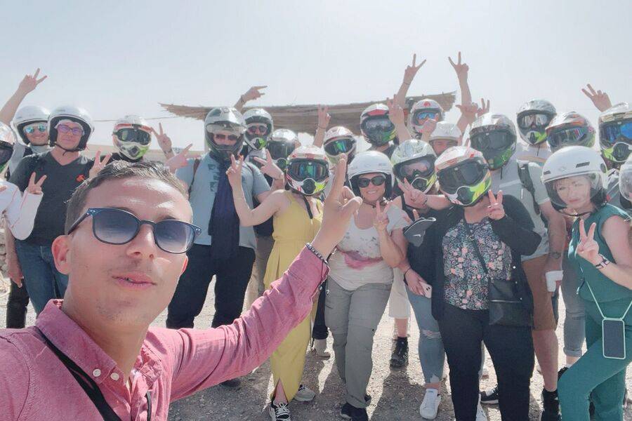 在阿法菲洛基沙漠骑骆驼和四轮摩托